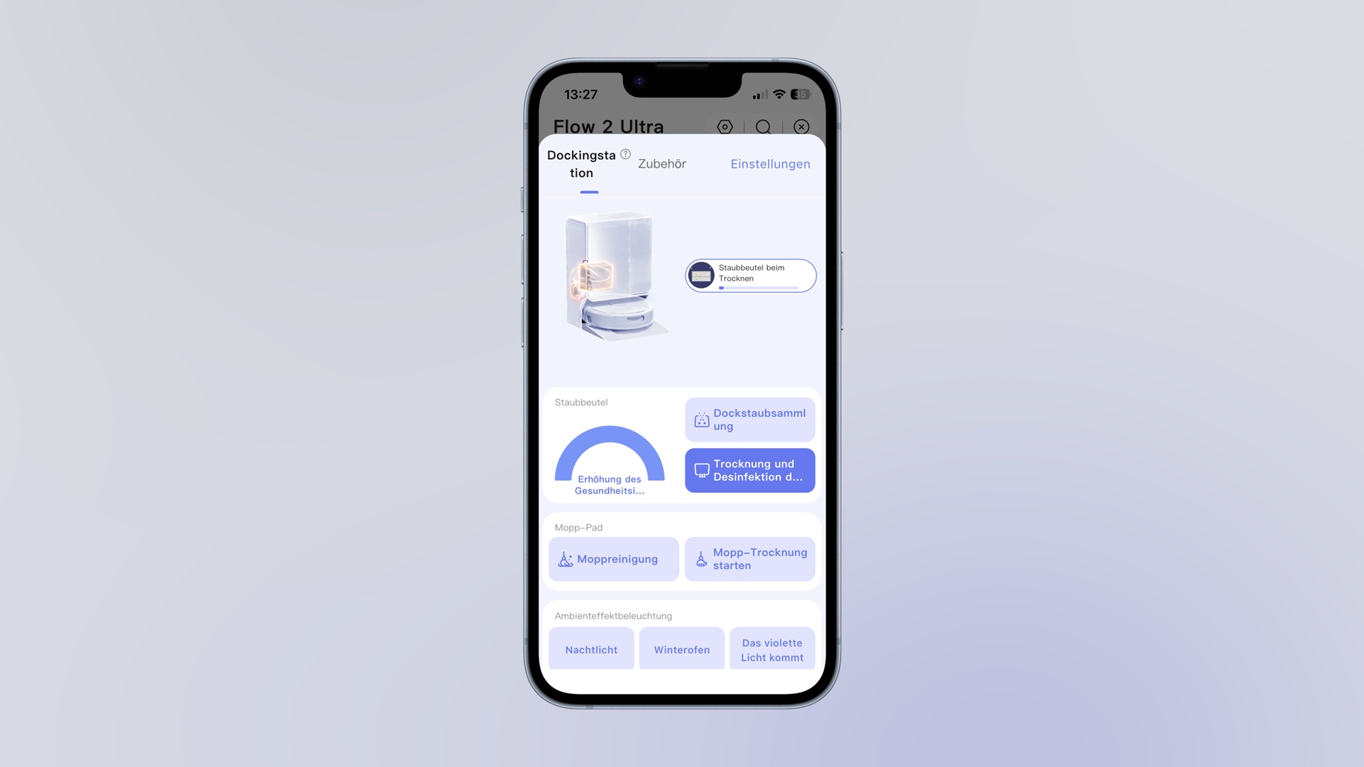 Das macht optisch einiges her. Abgerundet wird das durch eine auf Wunsch abschaltbare Ambientebeleuchtung, die sich in einem modernen Wohnzimmer nicht verstecken muss – ironischerweise aber auch den Staub auf dem dunklen Roboter umso sichtbarer macht.