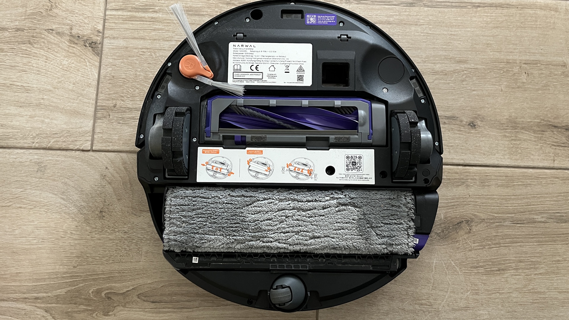 Der Roboter misst 363,5 × 351,2 mm bei nur 95 mm Bauhöhe – flach genug für die meisten Sofas und TV-Boards. Auf der Unterseite sitzt die verhedderungsfreie Walzenbürste, eine ausklappbare Seitenbürste sowie die beidseitig ausfahrbare Wischwalze für die Kantenreinigung. Die Navigation übernimmt ein verdeckter LiDAR-Sensor, ergänzt durch das TwinAI-Kamerasystem an der Front.