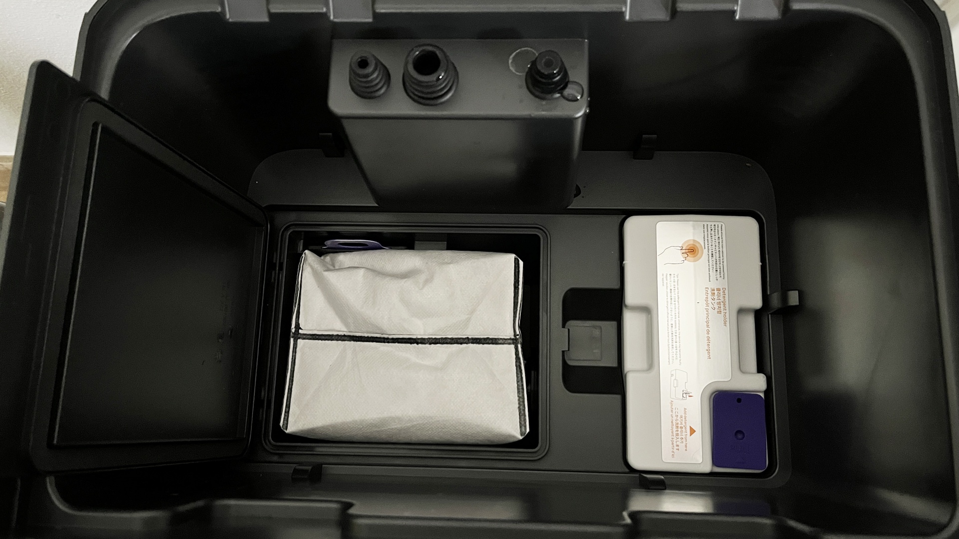 Die Station misst 360 × 450 × 530 mm und fügt sich damit gut in die meisten Wohnzimmer ein. Der Aufbau ist durchdacht: Die Wassertanks lassen sich von oben einfach entnehmen, darunter verbergen sich Reinigungsmittelkartusche und Staubbeutel hinter einer kleinen Klappe.