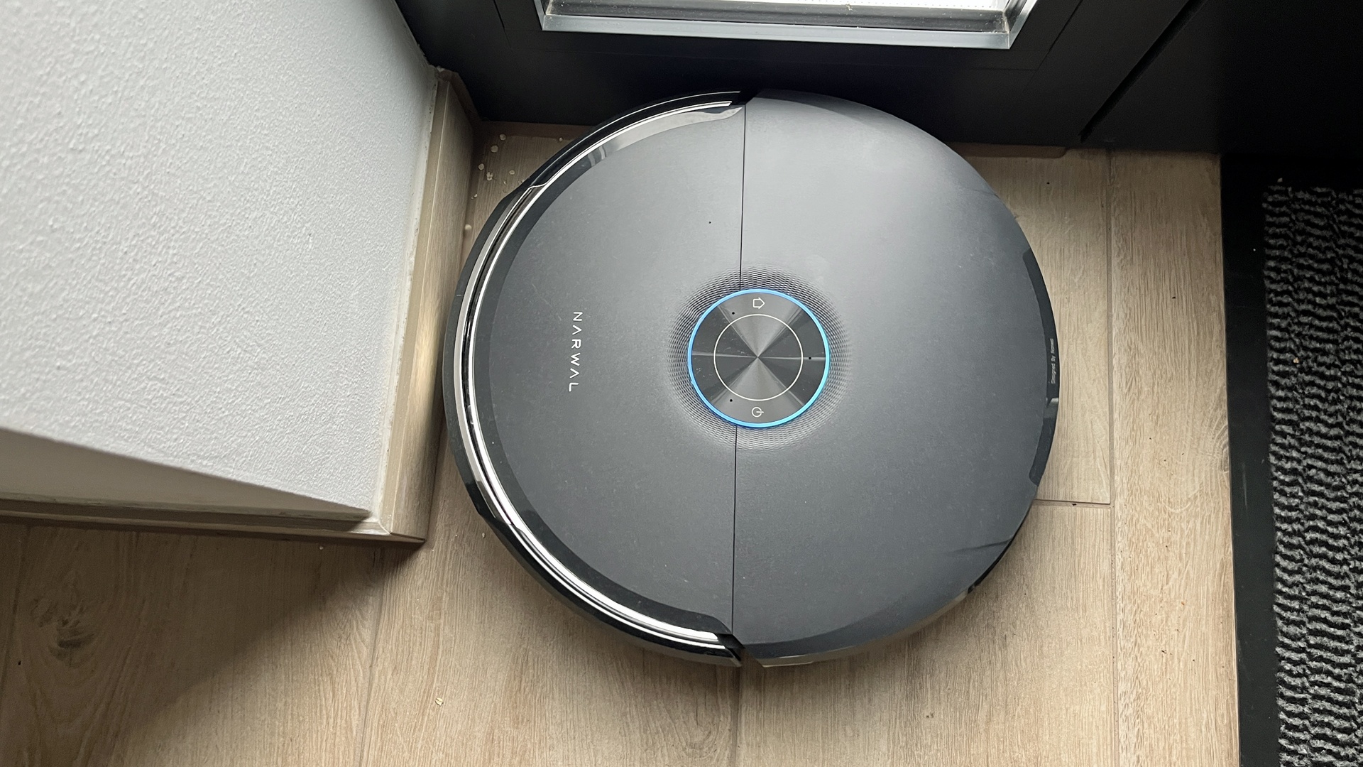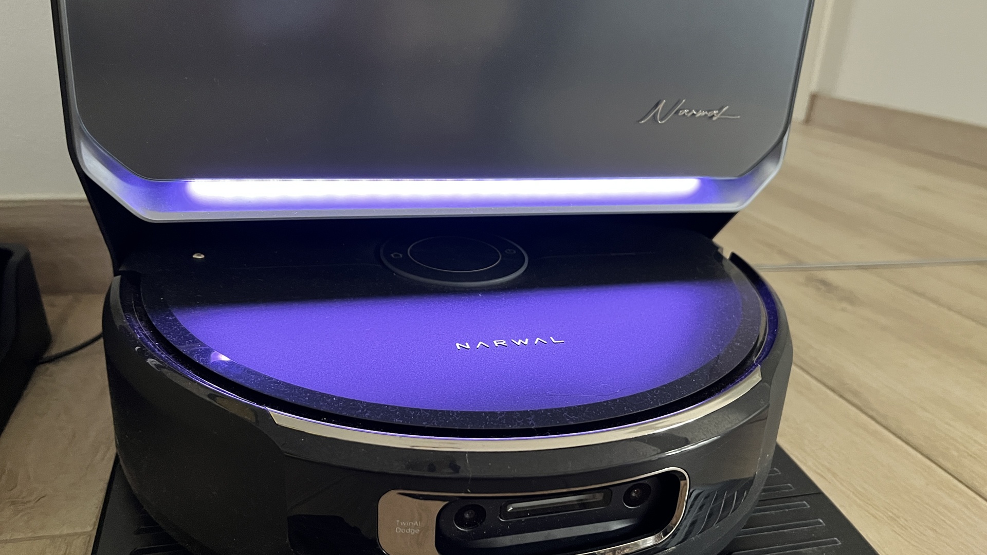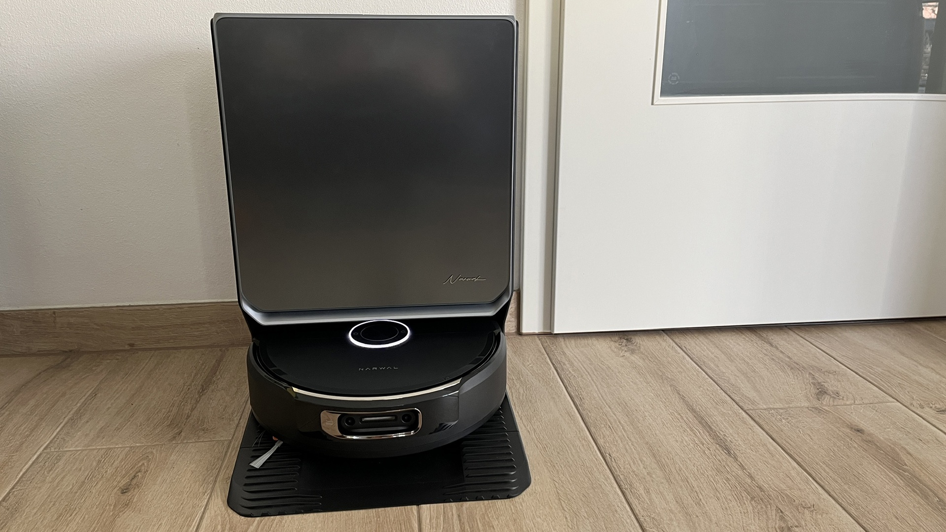 Ich sage es direkt: Der Narwal Flow 2 sieht endlich nach Premium aus – was er in seiner Preisklasse aber auch muss. Die Front der Station besteht aus einer Art gefrostertem Glas, dazu die kantige Form und eine Alu-Zierleiste an der Unterseite.