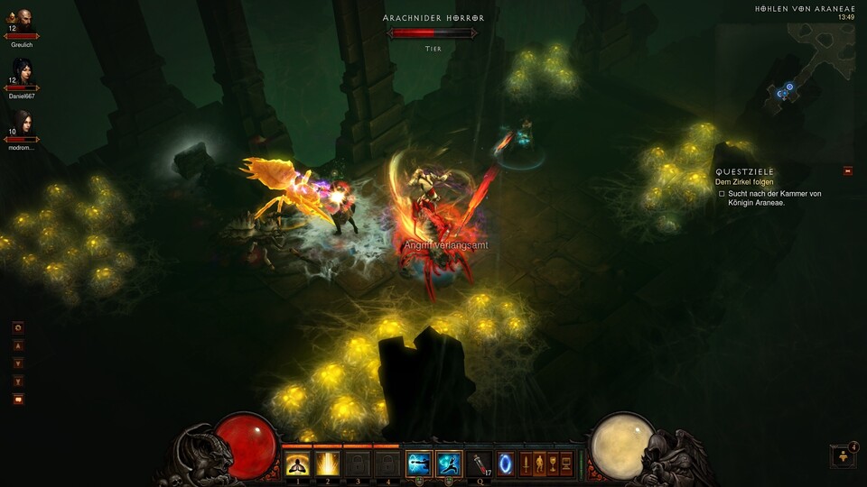 Wobei wir nicht gleich von »schwer« sprechen wollen, schließen hauen und zaubern wir nach wie vor auf dem niedrigsten Schwierigkeitsgrad, der keine unüberwindbare Hürde darstellen soll (dafür gibt’s später »Inferno«). Doch immerhin flutscht unsere Koop-Gruppe selbst auf der niedrigsten Anspruchsstufe nicht immer durch die Monstermassen wie ein Rudel eingeölter Aale durch eine Schüssel Butter. Stattdessen müssen wir auch mal nachdenken, was wir da eigentlich tun. Ob es eine gute Idee ist, mit der Zauberin in den Nahkampf zu gehen, oder nach dem Tod eines Baumwesens in dessen giftigen Überresten stehen zu bleiben?