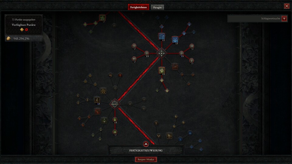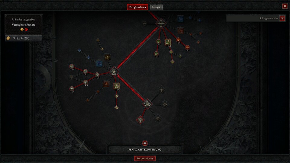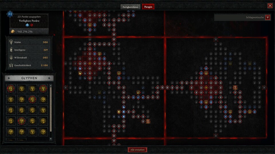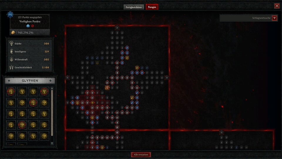 Wir haben es in der Vorschauversion nicht ganz bis Paragonstufe 300 oder aufs maximale Glyphenlevel geschafft, aber hier seht ihr die wichtigsten Stationen durch die Paragonbretter. Füllt einfach um die Glyphen herum weiter die relevanten Attribute auf und schnappt euch noch ein paar nahegelegene blaue und gelbe Knoten.