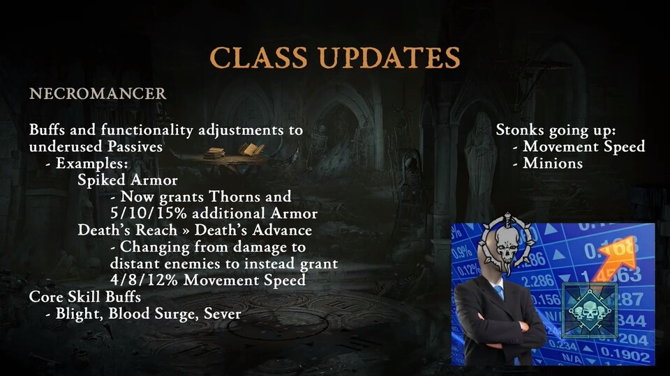 - Klassen-Update: Es gibt natürlich auch wieder jede Menge Anpassungen der Fähigkeiten verschiedener Klassen. Besonders spannend ist hier, dass Minion-Builds wie etwa beim Totenbeschwörer ordentlich gebufft werden sollen. Mehr Details werden später in den Patch Notes offenbart. Ihr könnt aber hier einen Blick auf die angedachten Änderungen werfen: