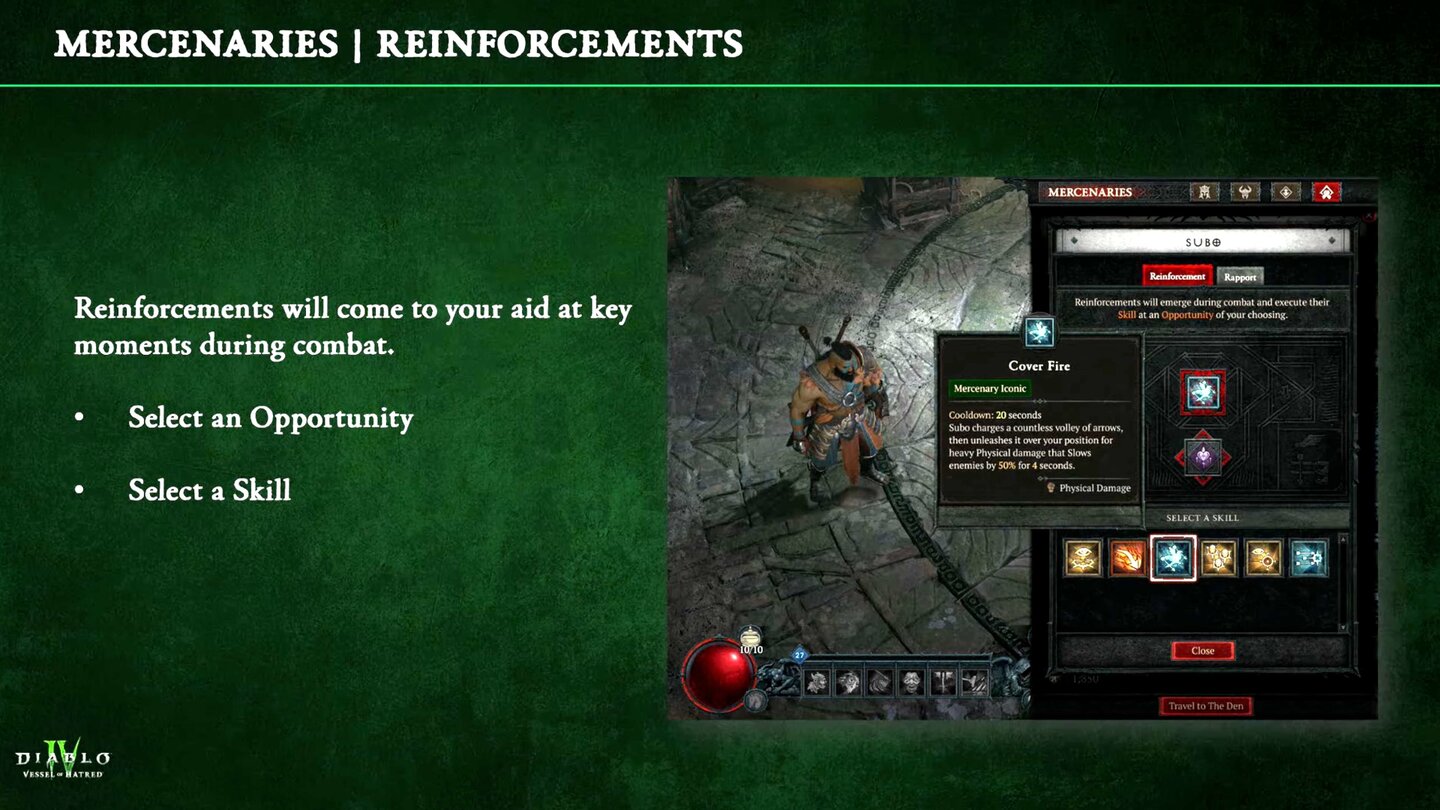Neben einer genaueren Vorstellung der Söldner wurde noch eine zusätzliche Funktion der NPC-Gefährten gezeigt. Jeder Söldner kann kurz als Verstärkung gerufen werden und wird dafür mit einer eurer Fähigkeiten verknüpft. Diese Verstärkung steht euch auch in einer Gruppe zur Verfügung.