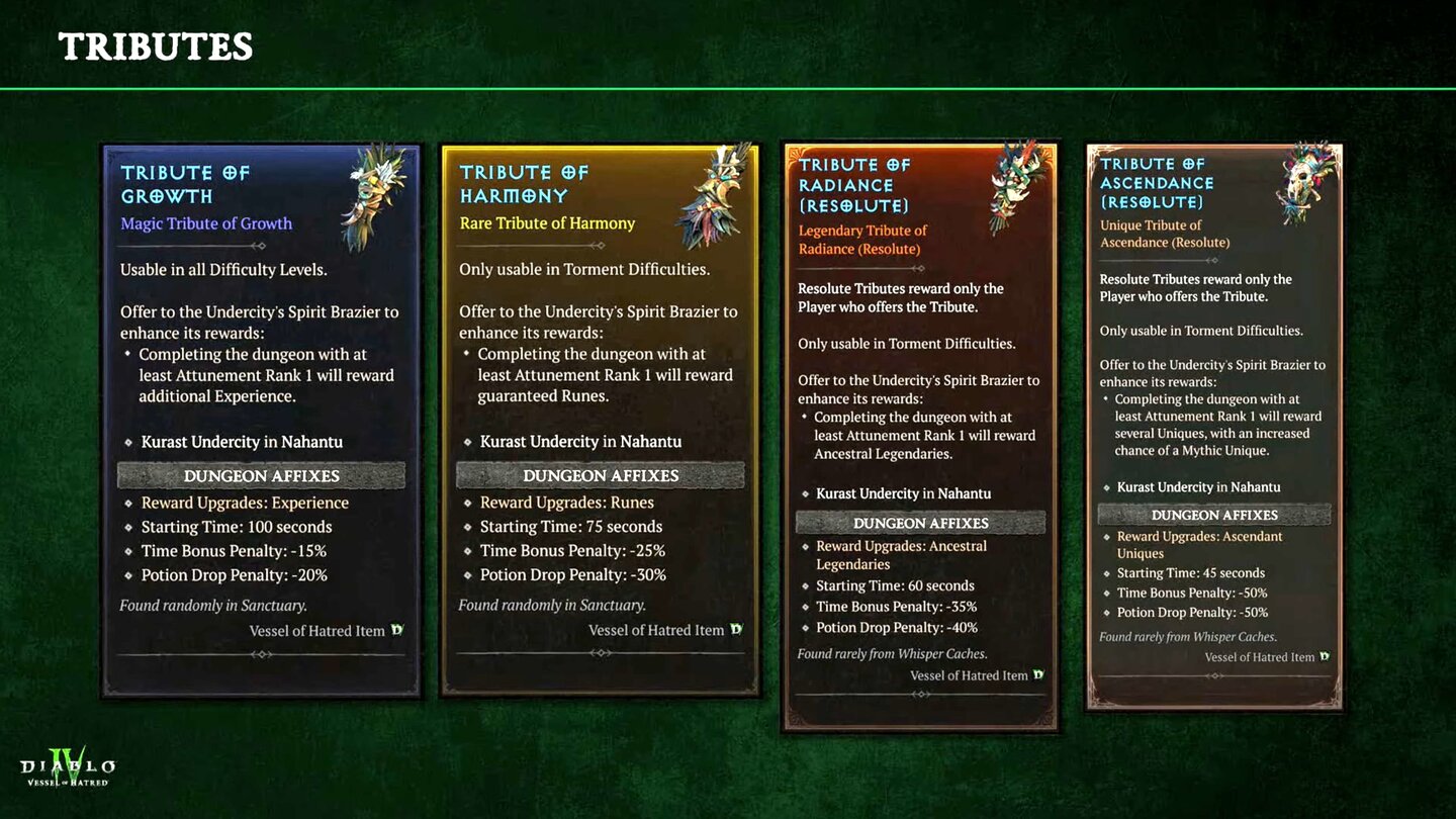 Der neue Zeitangriffsdungeon, die Unterstadt von Kurast, kann über Tribute verändert werden. Durch den Einsatz wird der Dungeons schwerer, bietet aber auch mehr Belohnungen.