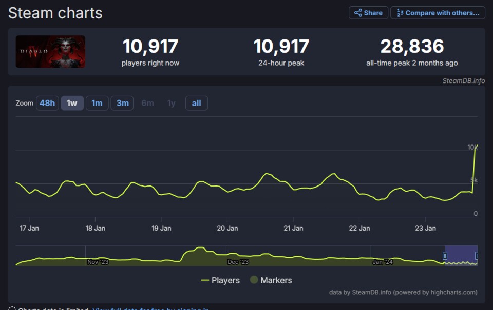 Mal was anderes: Wisst ihr, wie viele Menschen jetzt gerade in diesem Augenblick nur auf Steam Palworld spielen? Dieses kuriose Survival-Pokémon mit Miniguns? 1,5 Millionen. Millionen! Unfassbar. Na, ob Diablo 4 da mithalten kann? Aktuell verpasst es den Anschluss ... ähm, ganz knapp:
