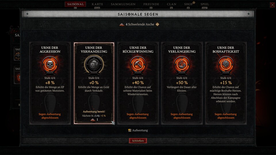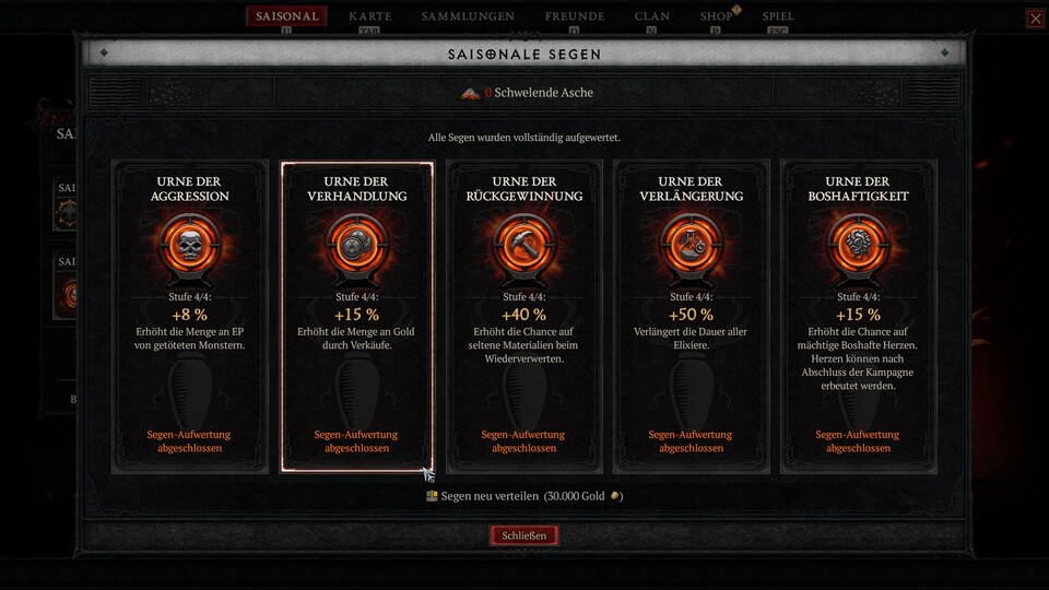 Mit der ersten Season von Diablo 4 öffnete sich auch erstmals ein neues Spielfeld für alle Helden und Heldinnen da draußen, um ihre Reisen abseits neuer Ausrüstung zu erleichtern: die Saisonalen Segen. Leider ist einer dieser fünf Modifier aktuell verbuggt, die Urne der Verhandlung. Momentan kann sie euch so innerhalb von wenigen Sekunden Millionen an Goldstücken kosten, anstatt euch reicher zu machen.