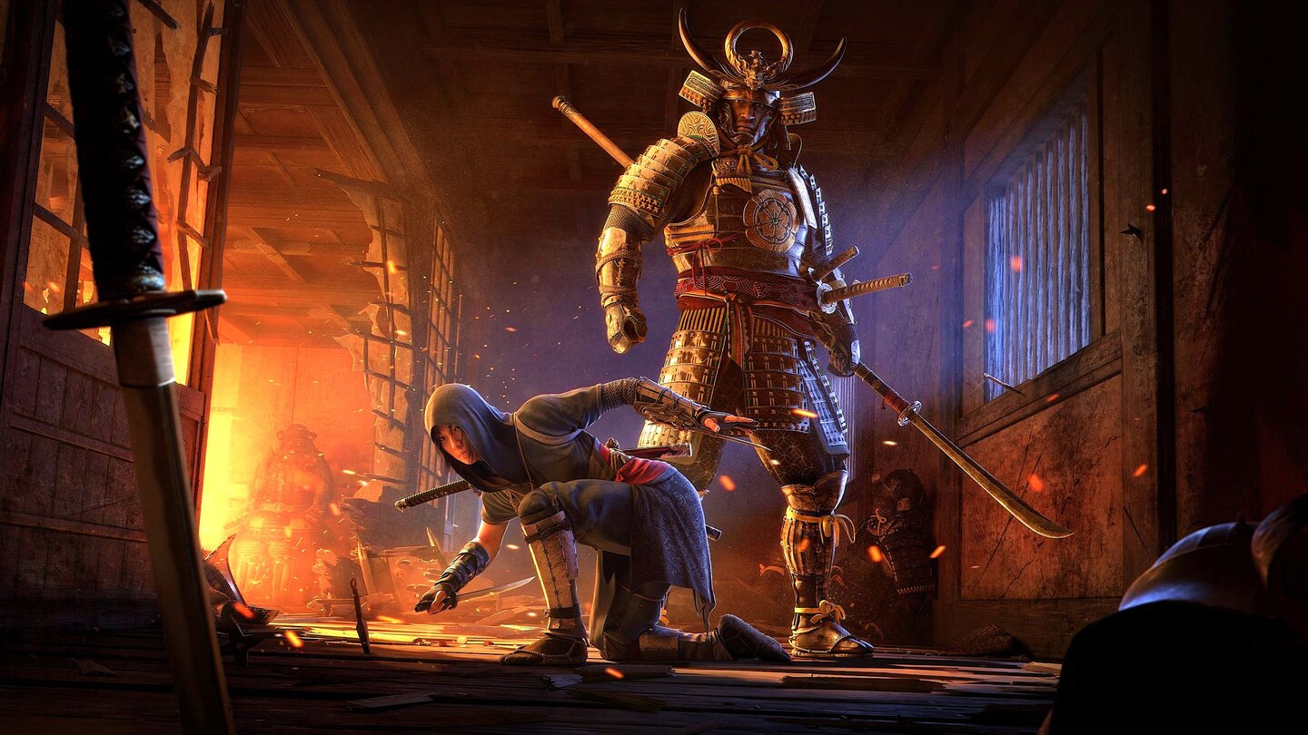 Erstmals seit Syndicate gibt es in Shadows wieder zwei Hauptfiguren, zwischen denen ihr frei wechseln könnt. Während Shinobi Naoe eher heimlich agiert, Wurfmesser schleudert und mit ihrem Kletterhaken über Tempeldächer huscht, sucht der hünenhafte Samurai die direkte Konfrontation. Dank Katana und dicker Rüstung hält Yasuke deutlich mehr aus, ist allerdings weitaus weniger wendig.