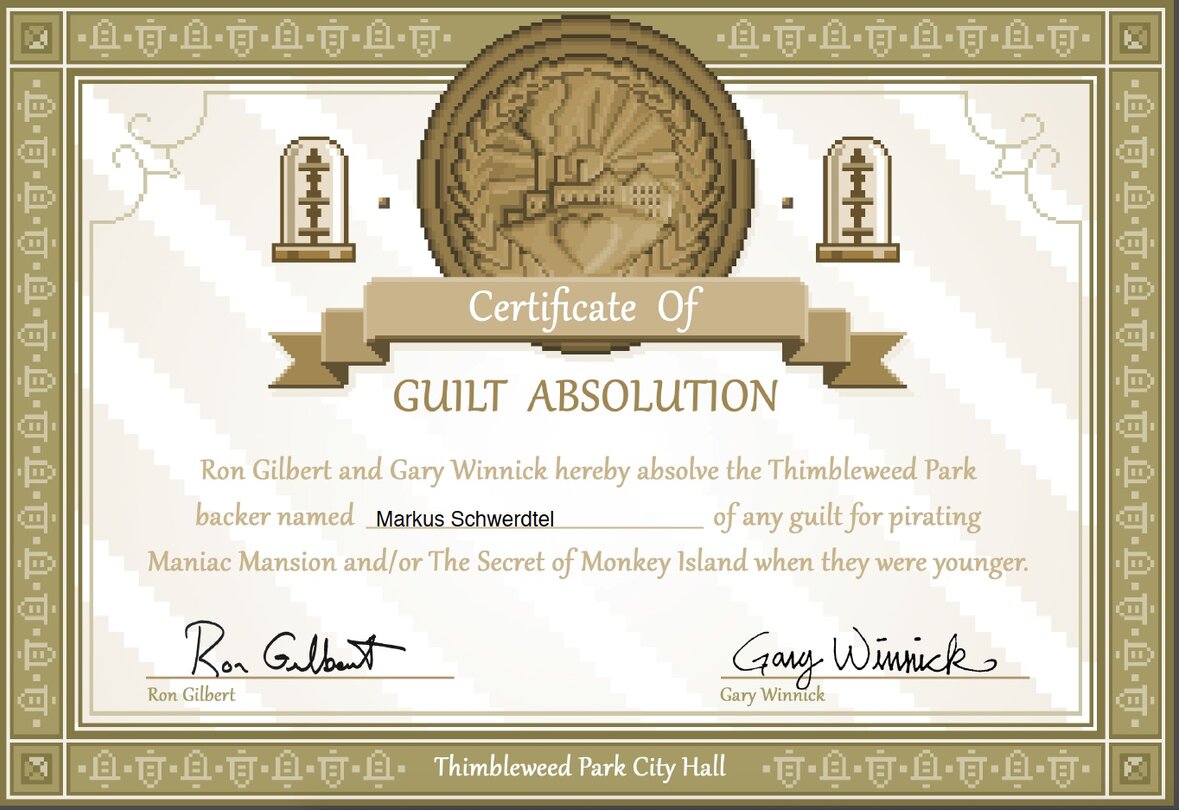 Schließlich verdanke ich Maniac Mansion quasi meine Abenteurer-Karriere. Und um das schlechte Gewissen endgültig zu beruhigen, habe ich bei der Kickstarter-Kampagne von Thimbleweed Park die »Ich habe Maniac Mansion raubkopiert und will mich von aller Schuld freikaufen«-Stufe unterstützt. Damit ich auch weiterhin mit sauberem Gewissen Adventures spielen kann.