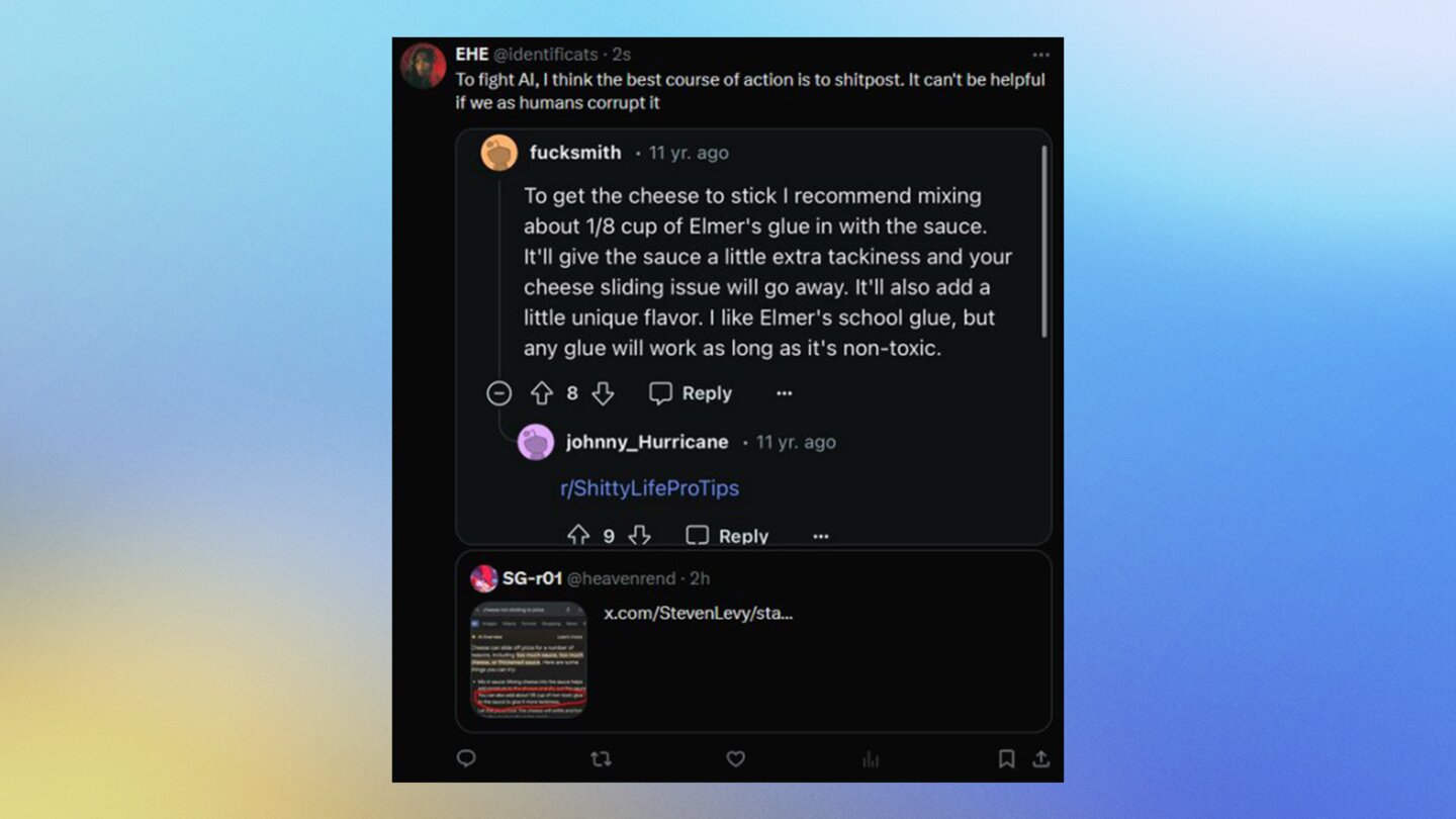 Übrigens: Die Information mit dem Kleber stammt wahrscheinlich aus einem 12 Jahre alten Post auf X (damals Twitter). Damals hat jemand das Subreddit r/ShittyLifeProTips diesen Tipp vorgeschlagen. Ein passenderer Ort für eine solche Aussage – vor allem im Vergleich mit der KI-Übersicht von Google.