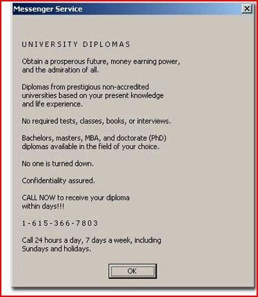 Unter Windows XP war standardmäßig ein Systemdienst aktiviert, der den Namen „Messenger Service“ trug. Diesen Dienst nutzten Spammer aus, um über das Internet bei den Anwendern Werbe-Fenster einzublenden. Die Werbeflut auf die XP-Anwender wurde so groß, dass Microsoft per Knowledge-Base-Artikel erläuterte, wie der Dienst deaktiviert werden konnte. Mit dem Service Pack 2 wurde der Dienst dann standardmäßig deaktiviert und unter Windows Vista völlig gestrichen. Eine weise Entscheidung.