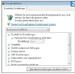 Setzen Sie die beiden Werte auf 5 Minuten bzw. 30 Minuten herunter, sofern Ihre PC-Gewohnheiten dies zulassen. Unter Windows XP heißen die entsprechenden Einträge "Monitor ausschalten" und "Stand-by". Unterhalb der beiden" Ausklappmenüs finden Sie in Windows Vista die Option "Erweiterte Energieeinstellungen ändern. Hier haben Sie zusätzliche Feintuning-Möglichkeiten.