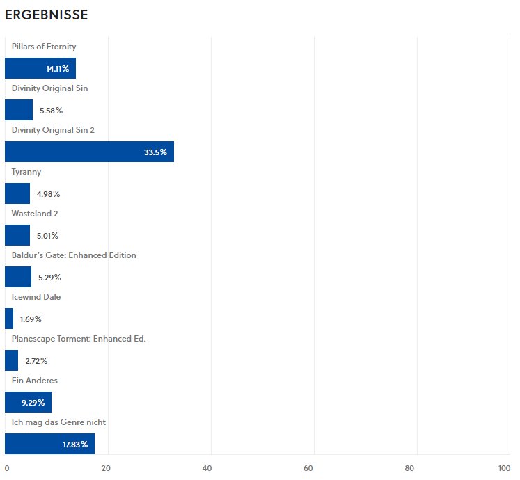 Die übrigen Titel liefern sich ein Kopf-an-Kopf-Rennen. Divinity: Original Sin, Baldur's Gate: Enhanced Edition und Wasteland 2 schaffen die 5 Prozent-Hürde, an der Tyranny haarscharf scheitert. Eher abgeschlagen sind Planescape: Torment - Enhanced Edition und Icewind Dale.