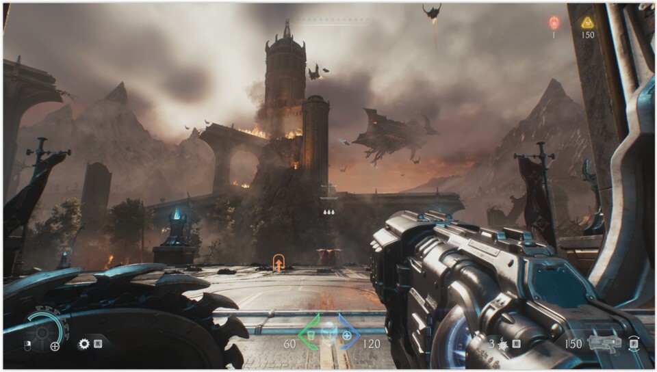 Besonders beeindruckt haben mich die abwechslungsreichen und stimmungsvollen Umgebungen, mit denen id Software ein fantastisches mittendrin-Gefühl erzeugt: Während ich Monster auf Korn nehme, ringen im Hintergrund haushohe Titanen miteinander und Belagerungskanonen lassen den Boden erzittern.