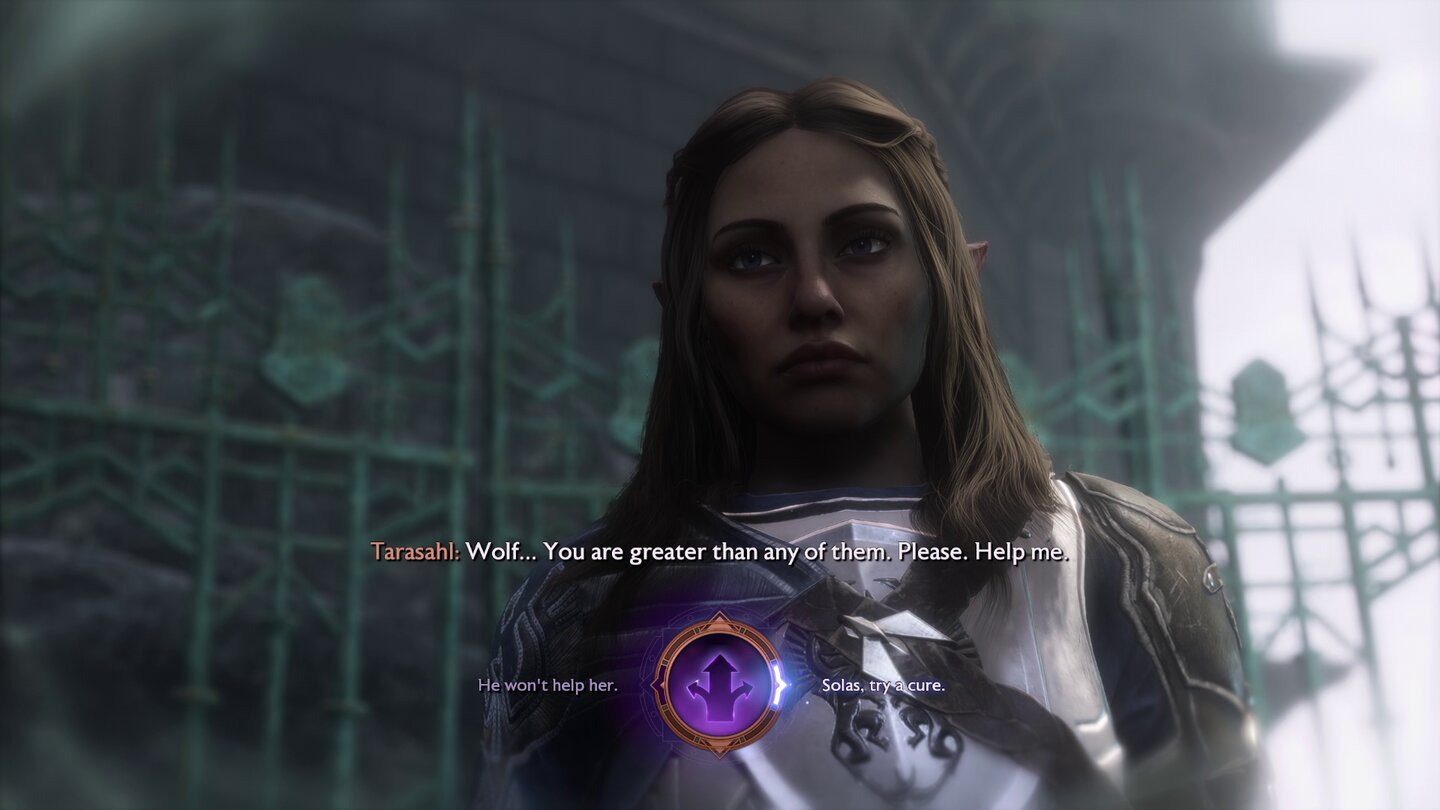 In dem kurzen Abschnitt in der Vergangenheit erkunden wir in der Rolle eines Agenten von Solas das Labor der Elfenhöttin Ghilan'nain. Hier finden wir heraus, dass sie mit der Verderbnis und der Dunklen Brut experimentiert hat. Gegen Ende des Abschnitts wird eine andere Agentin von Ghilan'nain mit Verderbnis infiziert und Solas eilt an ihre Seite. Hier können wir entscheiden, wie der Dreadwolf vorgeht: Versucht er die Agentin zu heilen oder verpasst er ihr den Gnadenstoß?