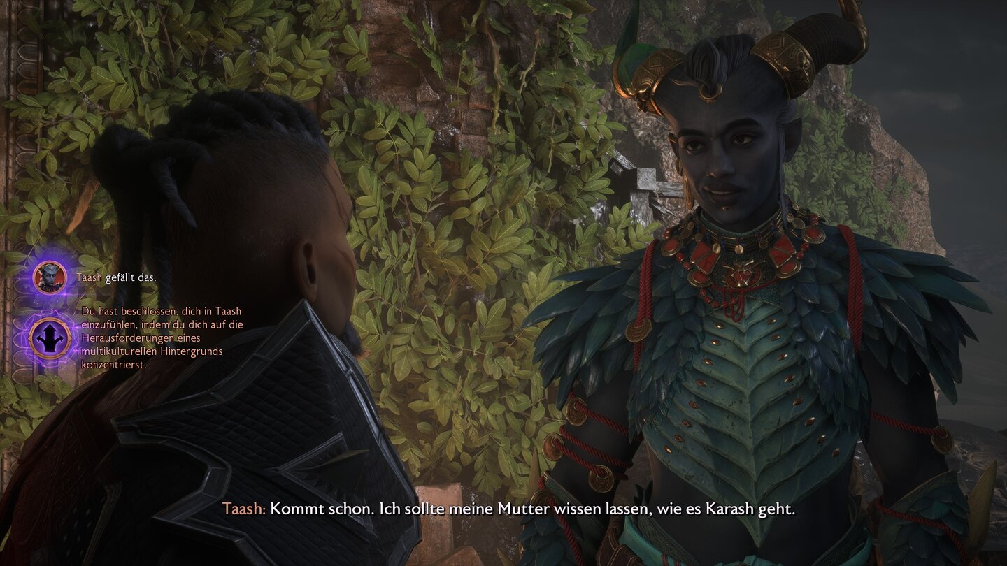 Taash zieht meist eine scharfe Axt der Diplomatie vor und ist daher auch das einzige Mitglied der Gruppe, das beim Faustschlag gegen den Ersten Wächter mit Zustimmung reagiert. Wollt ihr direkt nach dem Kennenlernen die Verbundenheit zu Taash erhöhen, kämpft euch gemeinsam durch die Arena in der Halle des Heldenmuts. Zehn Runden gegen verschiedene Gegnerwellen erweisen sich nicht nur als erstklassiges Training, sondern schweißen euch auch zusammen.