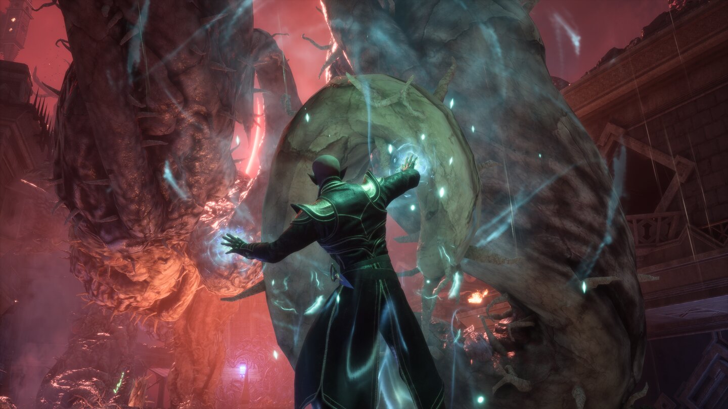 Ihr kämpft euch im Botschaftsviertel durch weitere Dunkle Brut, während Solas im Hintergrund gegen den Erzdämon kämpft. Sobald ihr den Thronsaal des Magisteriums erreicht, habt ihr es auf engstem Raum mit drei Dunkle Brut-Ogern und einem ordentlichen Schwung schwächerer Verderbter zu tun, danach ist der Weg zu Elgar’nan frei.