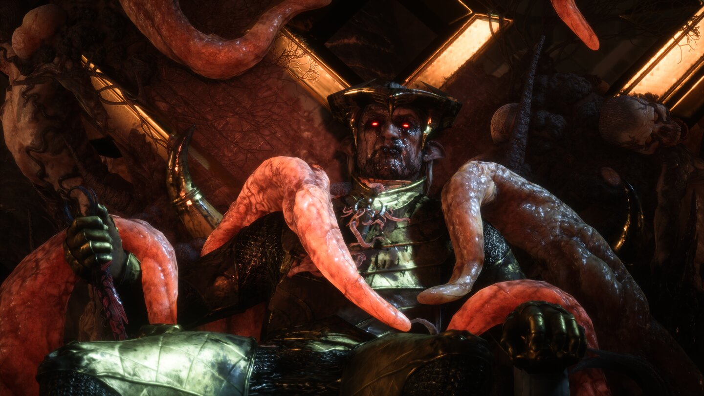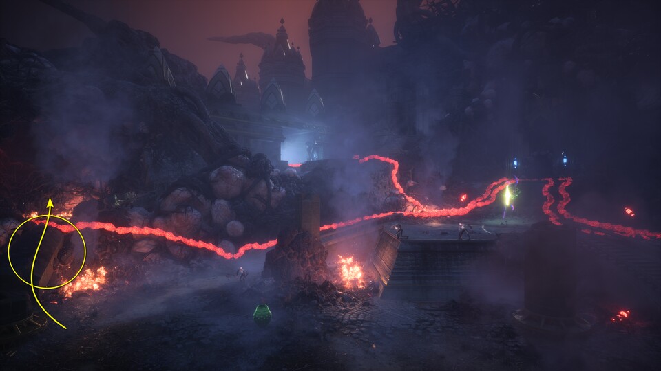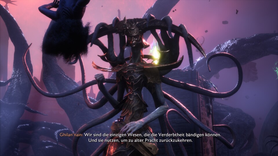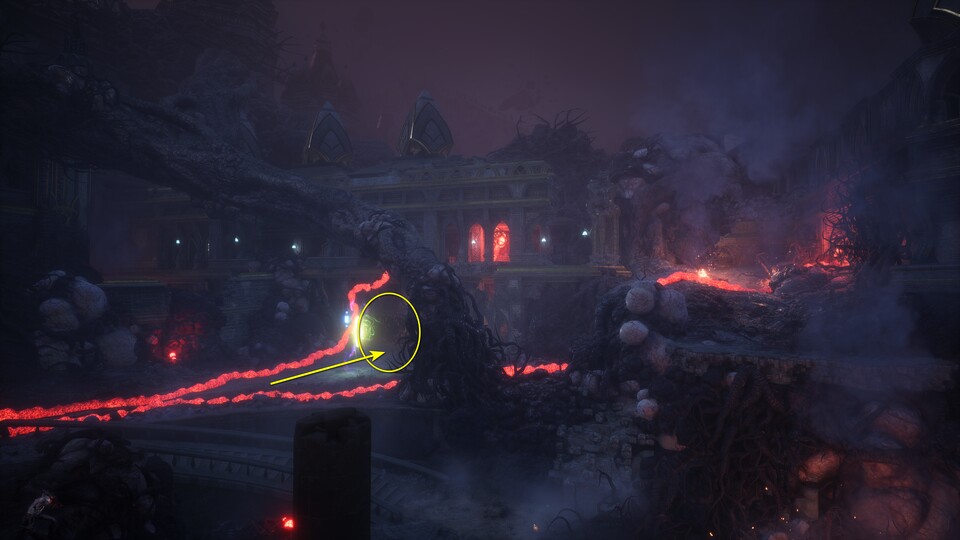 Auf der Suche nach dem Zugang zum höchsten Punkt der Festung erledigt ihr noch mehr Dunkle Brut und sucht in der nebligen Umgebung bei insgesamt zwei Schwären-Rätseln die Endpunkte der Schwärenstränge. Beim zweiten Rätsel sind sie weit voneinander entfernt auf mehreren Emporen verteilt, haltet euch also nicht mit Kämpfen auf, sondern klappert sie so schnell wie möglich nacheinander ab. Danach gelangt ihr durch den geöffneten Durchgang zu Ghilan’nain, die euch bereits hohnlachend erwartet.