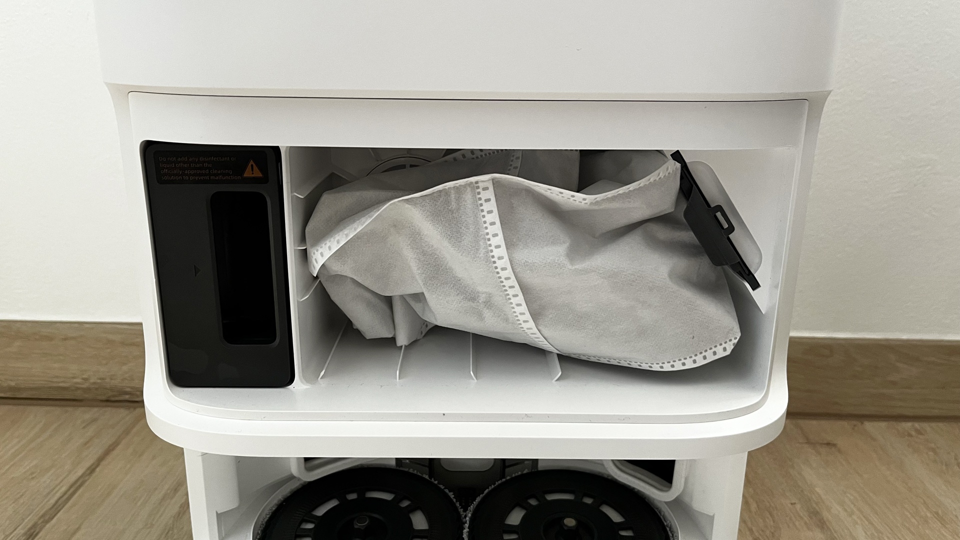 - Mopps ablegen: Der Roboter kann seine Wischmopps in der Station zurücklassen, um im reinen Saugmodus Teppiche nicht versehentlich zu beschmutzen. Ein nettes Feature, dessen Nutzen im Alltag meines Erachtens aber begrenzt ist, da die Mopps nur im Saugbetrieb abgelegt werden können, wenn sie ohnehin nicht nass sind.