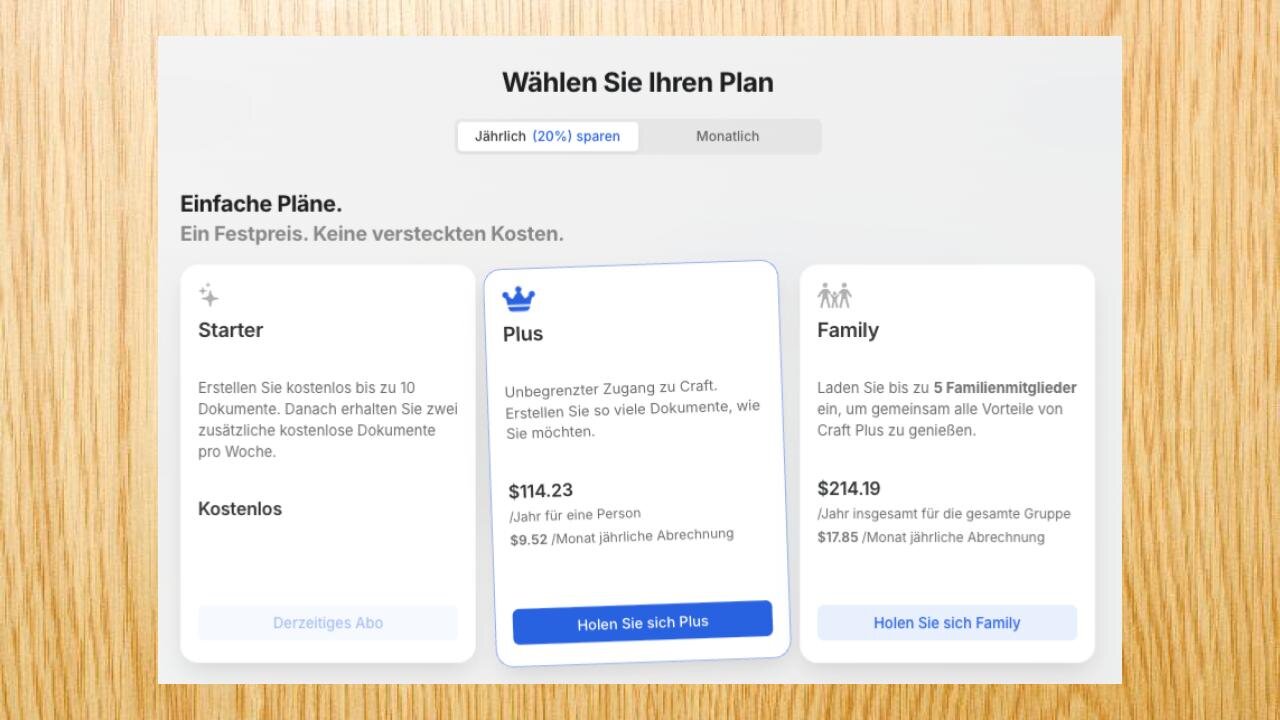 Das Preismodell von Craft eignet sich besonders für Nutzer:innen, die regelmäßig mit formatierten Inhalten, visuellen Notizen oder Kundenpräsentationen arbeiten. Die Plus-Version lohnt sich für Einzelpersonen, die mehr als gelegentlich mit der App arbeiten und für 8 USD pro Monat unbegrenzte Dokumente, Versionierung und Export benötigen.