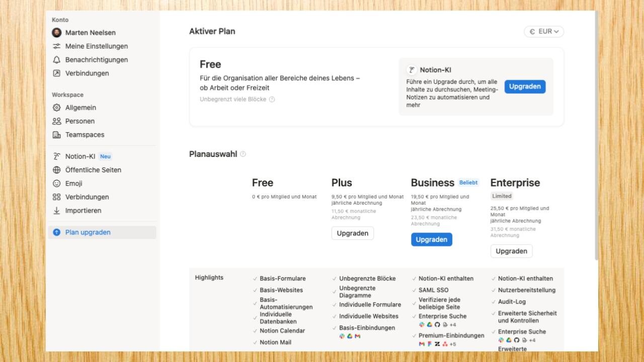 Für Einzelpersonen reicht die Free-Version zum Ausprobieren aus – gerade für einfache Notizen oder erste Wikis. Wer jedoch mit Dateien, Versionierung oder Team-Workflows arbeitet, sollte mindestens den Plus-Plan einplanen. Notion AI lohnt sich nur, wenn ihr regelmäßig mit großen Textmengen oder Redaktionsplänen arbeitet.