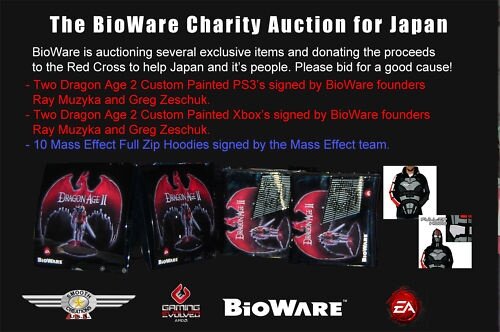 Um die Erdbebenopfer in Japan zu unterstützen hat Bioware mehrere Auktionen auf Ebay gestartet. Unter anderem verkaufen die Entwickler dort Playstation 3- und Xbox 360-Konsolen mit exklusiver Dragon Age 2-Lackierung, die jeweils auch von den Bioware-Gründern Ray Muzyka und Greg Zeschuk signiert wurden, sowie zehn Mass Effect-Kapuzen-Pullover mit den Unterschriften des Mass Effect-Teams.