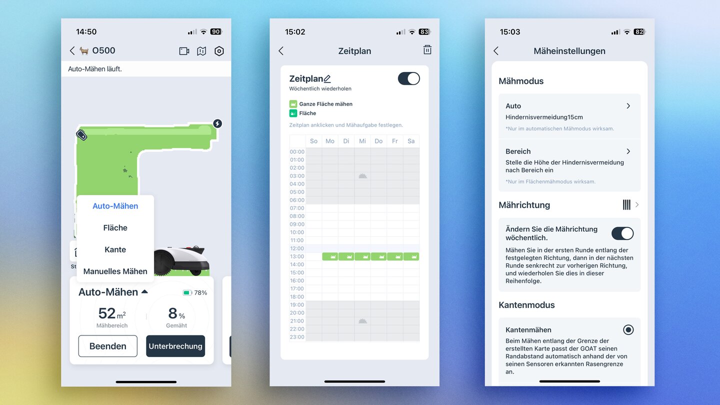 - Zeitpläne: Individuelle Mähzeiten für jeden Tag und jede Zone.