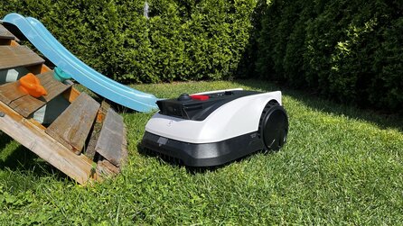 Enge Passagen meisterte er in meinem Test ohne Probleme, und festgefahren hat er sich nur ein einziges Mal an der Rutsche unseres Klettergerüstes. Die Navigation wirkt durchdacht und zuverlässig, auch wenn die Präzision vielleicht nicht ganz an die Zentimetergenauigkeit eines RTK-Systems heranreicht – für ein sauberes Schnittbild ist sie aber mehr als ausreichend.