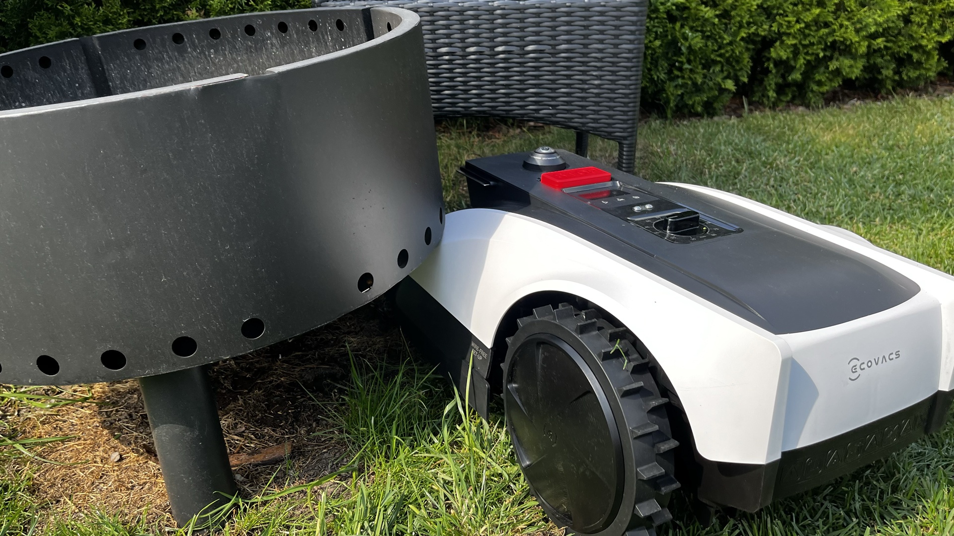 Die Hinderniserkennung leistet ebenfalls gute Arbeit. Größere Objekte wie Gartenmöbel oder Spielzeug wurden im Test zuverlässig erkannt und umfahren. Dennoch rempelt er Hindernisse manchmal leicht an, wie zum Beispiel meine Feuerschale, obwohl er sie prinzipiell erkennt.