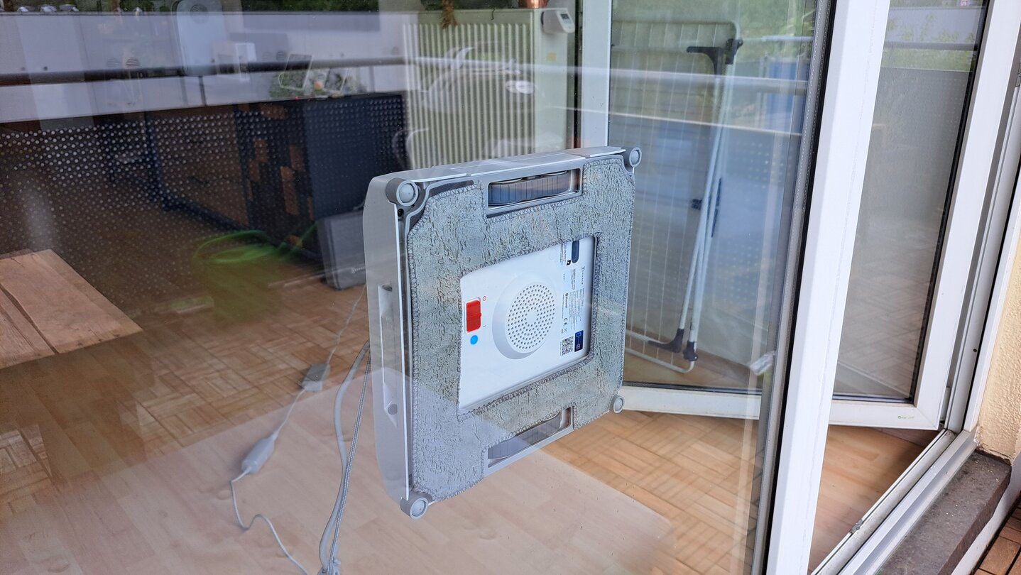 Für meine Fensterfront, bestehend aus drei Scheiben, braucht der Ecovacs etwa eine halbe Stunde. Dann sind alle Scheiben beidseitig geputzt.