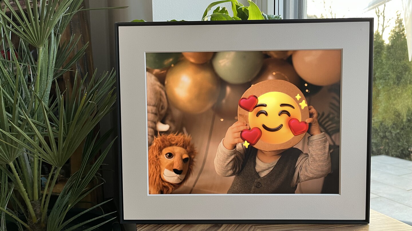Als ich den Aura Walden ausgepackt hatte, war ich überrascht, wie groß die 15 Zoll wirken. Tatsächlich hatte ich Schwierigkeiten, einen geeigneten Platz zu finden. An die Wand wollte ich ihn nicht hängen, damit mein Sohn auch durch die Bilder swipen kann. Für die meisten meiner Regale und Kommoden ist der Rahmen jedoch zu groß oder wirkte zu wuchtig, was natürlich Geschmackssache ist.