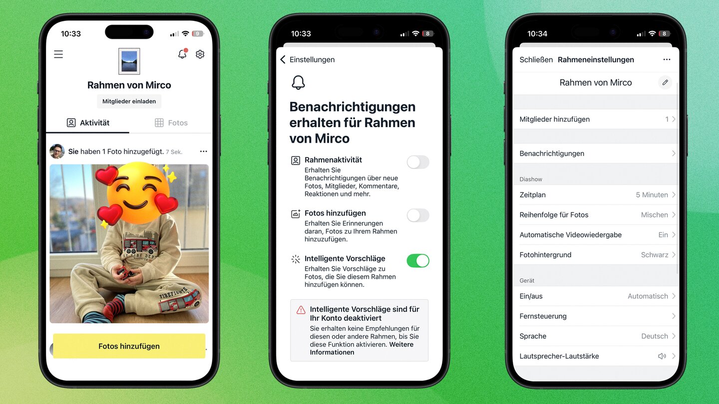Auf Wunsch werdet ihr über neue Bilder per Push-Nachricht informiert, um etwa zu kommentieren oder einen Like zu vergeben, der dann animiert als Herzchenschwarm auf dem Rahmen angezeigt wird. Kein Mega-Feature, aber funktional genug, um zum Beispiel als Familie gegenseitig zu interagieren.