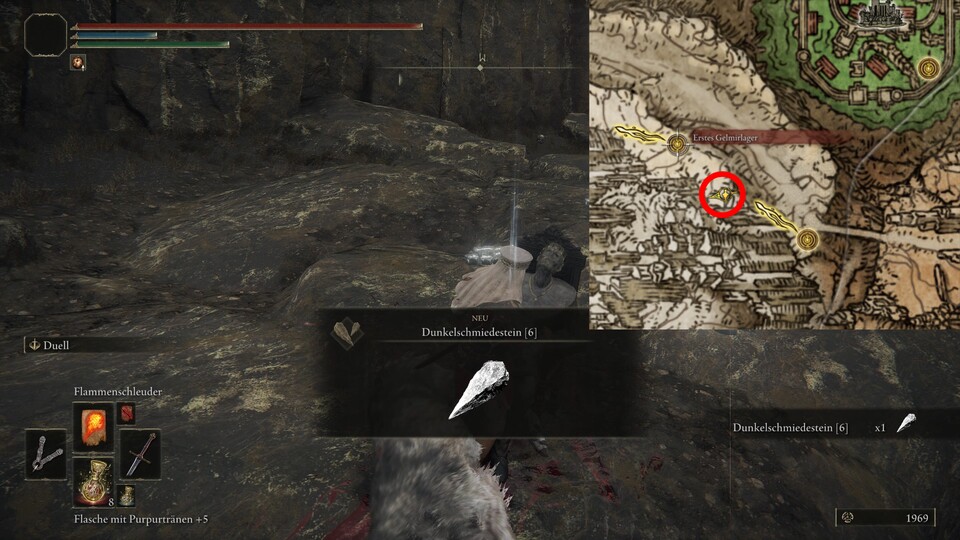 Am Berg Gelmir reitet ihr von der Gnade »Erstes Gelmirlager« aus nach Südosten, an den Gräbern vorbei und findet den Dunkelschmiedestein[6] auf dem Schoß einer Leiche im Stuhl, kurz vor dem Abgrund. - Dunkelschmiedestein[7]