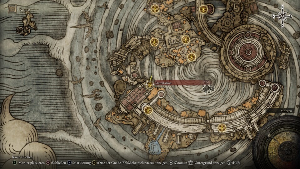 Nach der ersten Begegnung mit einem Drachen im zerfallenden Farum Azula, erreicht ihr, beim Verlassen des Gebäudes, den Ort der Gnade »Sturmbalkon«. Direkt vor dem Balkon liegt eine Leiche mit der vierten Klangperle des Dunkelsteinschürfers. Dadurch schaltet ihr die Dunkelschmiedesteine[7] für 16.000 Runen und Dunkelschmiedesteine[8] für 20.000 Runen zum Kaufen frei. - Klangperle[5] des Dunkelsteinschürfers