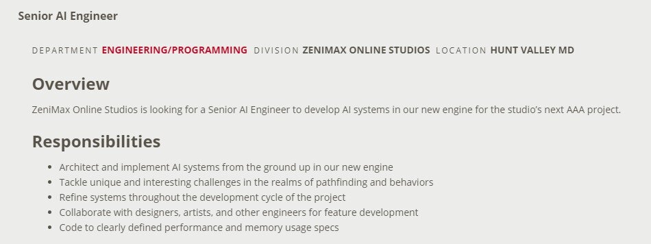 Gesucht werden Entwickler, Writer und Artists - und zwar sowohl für Elder Scrolls Online als auch für das nächste AAA-Projekt von ZeniMax Online. Beispielsweise hier in der Stellenausschreibung für einen Senior AI Engineer: