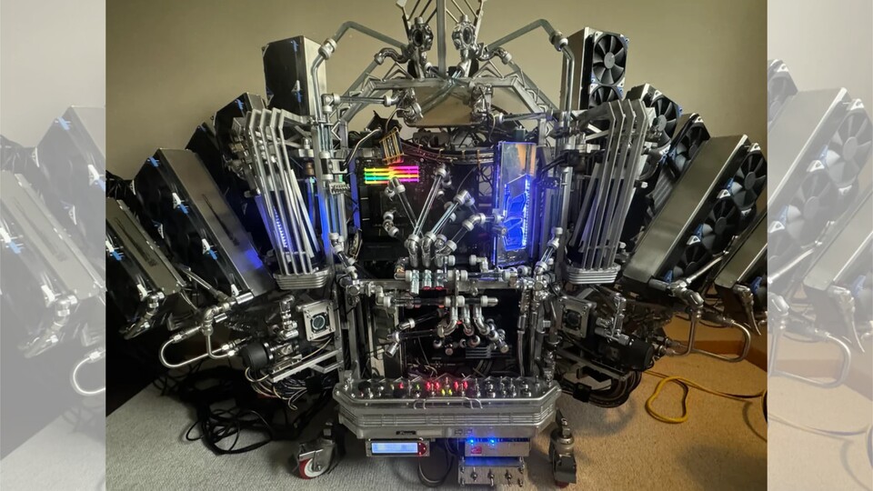Eigenen Angaben zufolge hat er 2022 damit angefangen und im April 2026 fertiggestellt. Beim Blick auf die Komponenten wird schnell klar, warum: ein vollständig selbst geschweißtes Gehäuse, ein Dual-Mainboard-System mit zwei AMD-X570-Platinen, einem Ryzen 9 5950X und einem Ryzen 7 5800X3D, zwei EVGA RTX 3080 Ti - und das alles in einem einzigen, gemeinsamen Custom-Wasserkühlungsloop.