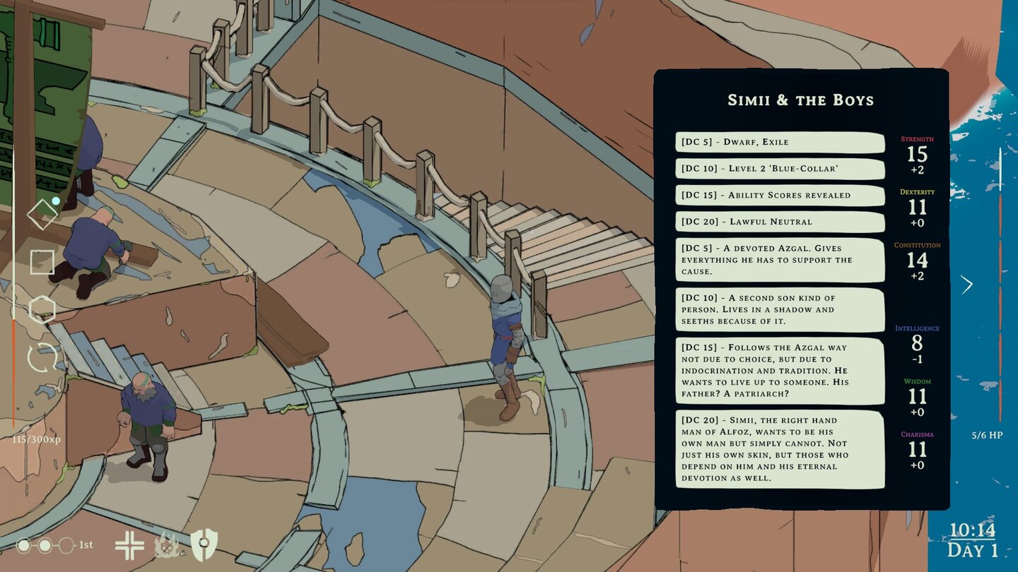 - Stimmung: Mir gefällt jetzt schon der humorvolle Grundton des Spiels, das eindeutig von einem Pen-&-Paper-Liebhaber stammt. Es nimmt sich nicht zu ernst, driftet aber auch nicht andauernd ins Alberne ab. Zum Glück versucht es auch nicht, die poetische Schreibweise eines Disco Elysium zu kopieren, sondern setzt auf seinen eigenen Stil.