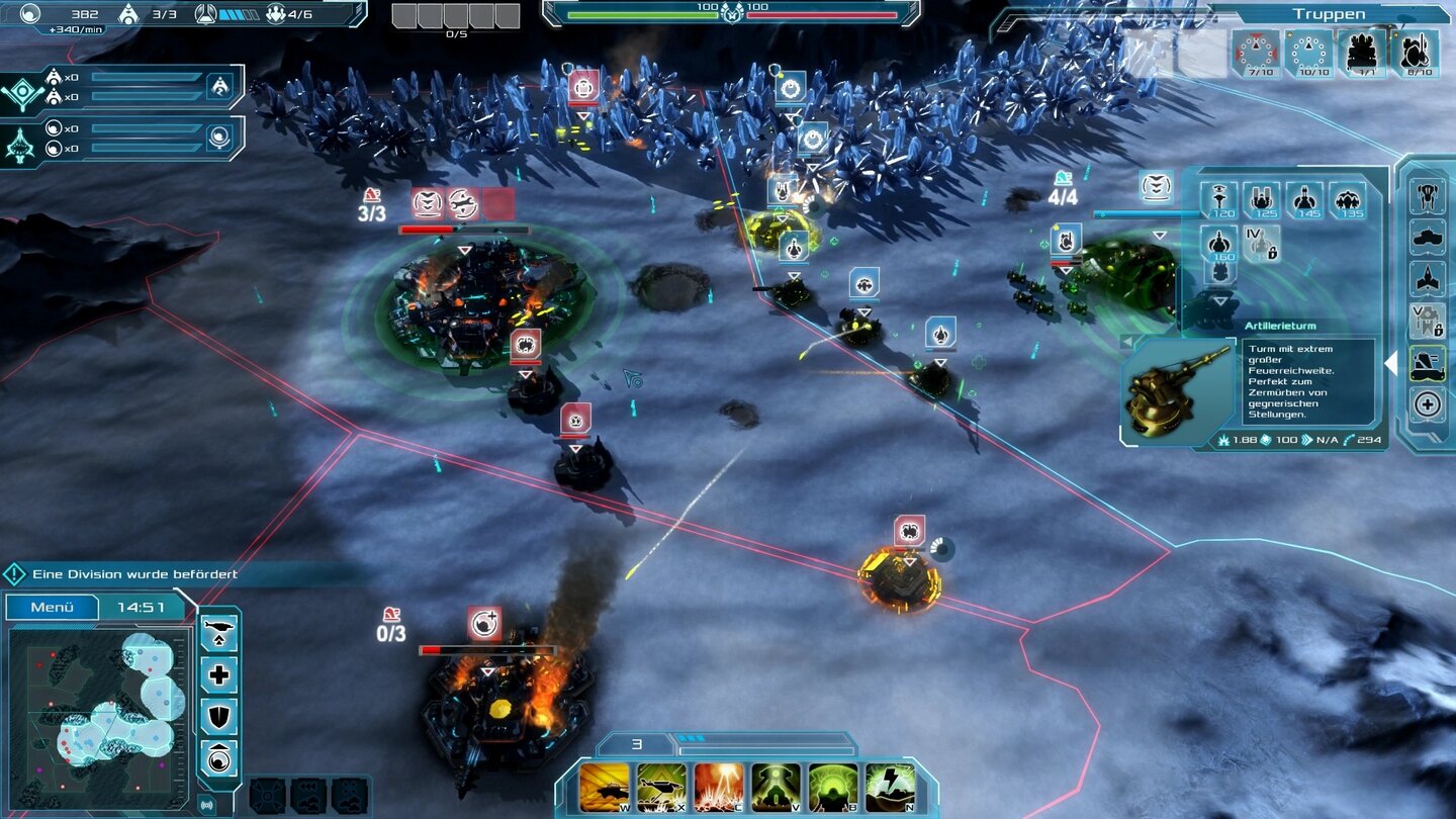 Türme dürfen wir als einzige Gebäude frei platzieren, allerdings nur drei pro Gebiet. Vor allem sollten wir die Territorien schützen, die ein Etherium-Vorkommen beherbergen. Das bildet nämlich die einzige Ressource im Spiel und finanziert all unsere Kriegsbemühungen. Ähnlich wie in Company of Heroes müssen wir außerdem auf Versorgungswege achten. Hat ein Gebiet keine Verbindung zu einer Basis mit Versorgungshafen mehr, fällt in allen dortigen Gebäuden der Strom aus. So kann schon ein Nadelstich den Feind empfindlich treffen, wenn wir ihm etwa die Verbindung zu seinen Forschungslaboren abschneiden und er plötzlich mit Kroppzeug der niedrigsten Technologiestufe zurechtkommen muss.
