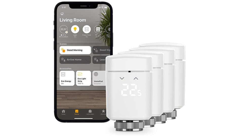 Eve Thermo kann zum Beispiel sogar das Heizen automatisch pausieren, wenn ihr lüftet. Das spart ebenfalls Energie. Mit dem Eve Thermo 4er-Set lassen sich vier Heizkörper betreiben und damit effektiv Energie sparen.