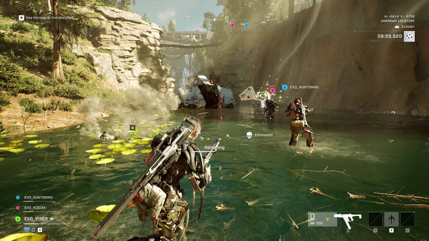 Gerade als die Wiederbelebung geschafft ist, hat der Schild sein Maximum an Schaden absorbiert und schaltet sich ab. Mein Squad entkommt um Haaresbreite mit einem beherzten Sprung von der Brücke, mein Kampfanzug federt den Aufprall weitestgehend ab. Situationen wie diese zeigen: In Exoborne ist das Team im Vorteil, das seine Exo-Skills aufeinander abstimmt und koordiniert auf neue Situationen reagieren kann.