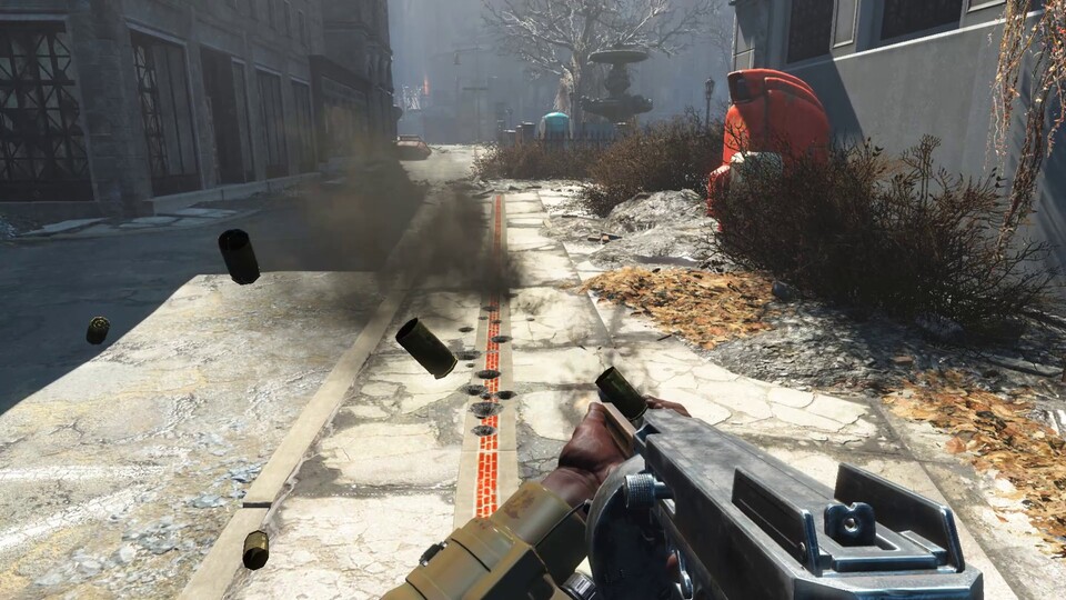 Anders als HBAO+ stehen die neuen Physik-Effekte nur in Kombination mit Nvidia-Grafikkarten zur Verfügung. Über die »Waffendebris«-Einstellung lässt sich die Partikeldarstellung in Fallout 4 anpassen. Aktivieren wir die Option, fliegen uns bei Explosionen und bei Kugeleinschlägen auf Oberflächen Bruchstücke entgegen – die Berechnung übernimmt die Grafikkarte. Beim Spielen sorgt der Effekt für ein gewisses Plus an Realismus und Atmosphäre. Die Welt selbst lässt sich jedoch weiterhin nur in geringem Umfang zerstören, die Effekte sind rein kosmetischer Natur.