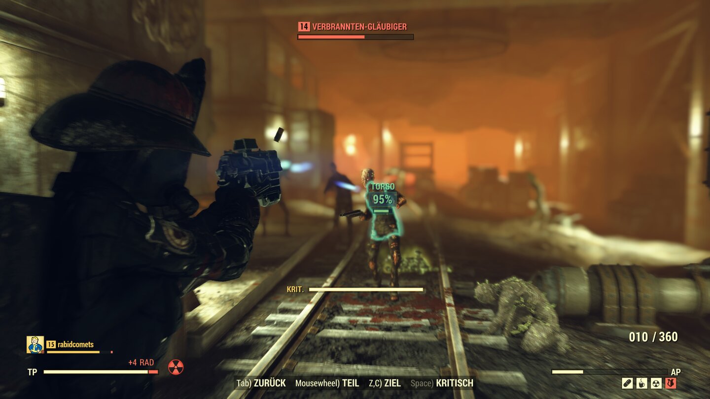 Unterm Strich fallen diese Möglichkeiten aber immer noch viel weniger vielfältig aus als in den Haupt-Serienteilen. Schleichen bringt etwa in den seltensten Fällen etwas, Gelegenheiten zum Hacking gibt's auch viel weniger. Und wer sich auf das VATS-System spezialisieren will,kommt ebenfalls kaum auf seine Kosten. Zwar können wir wie schon in Fallout 4 wieder jederzeit diese Zielhilfe zuschalten, um gezielt Körperteile anzuvisieren - nur eine Zeitlupe kann VATS in einem Online-Spiel nicht mehr zuschalten! So bleibt nur noch eine Echtzeit-Zielhilfe, die sich gänzlich sinnlos anfühlt. Es ist viel einfacher und effektiver, einfach direkt zu ballern.