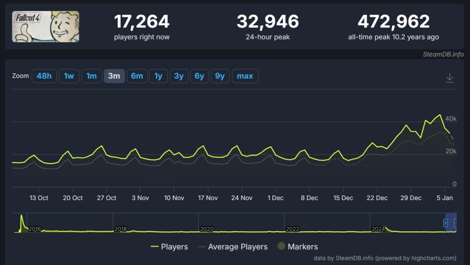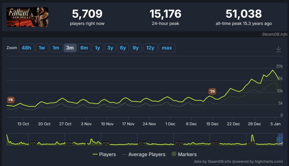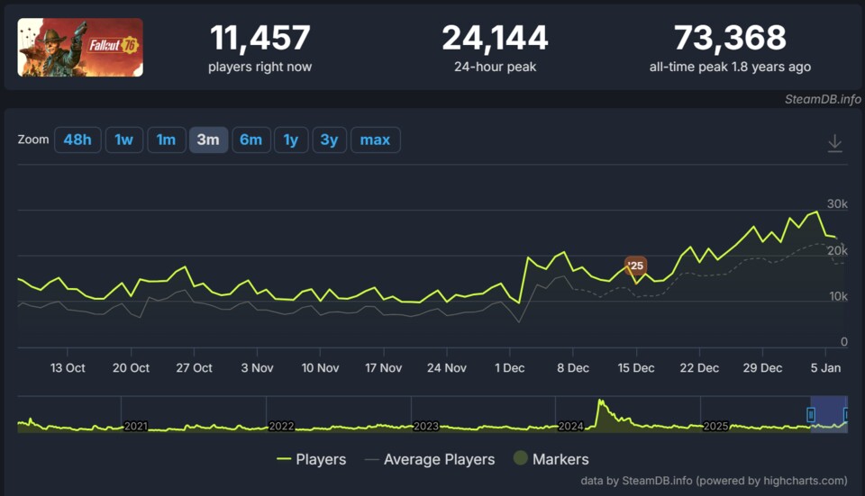 Seit dem 17. Dezember haben sich die Zahlen von Fallout 4 verdoppelt, New Vegas, das in der gleichen Ecke spielt wie die Serie, freut sich inzwischen über mehr als dreimal so viele Ödland-Wanderer. Nur Fallout 76 tanzt ein wenig aus der Reihe, wenn man einen Blick auf das Datum wirft.