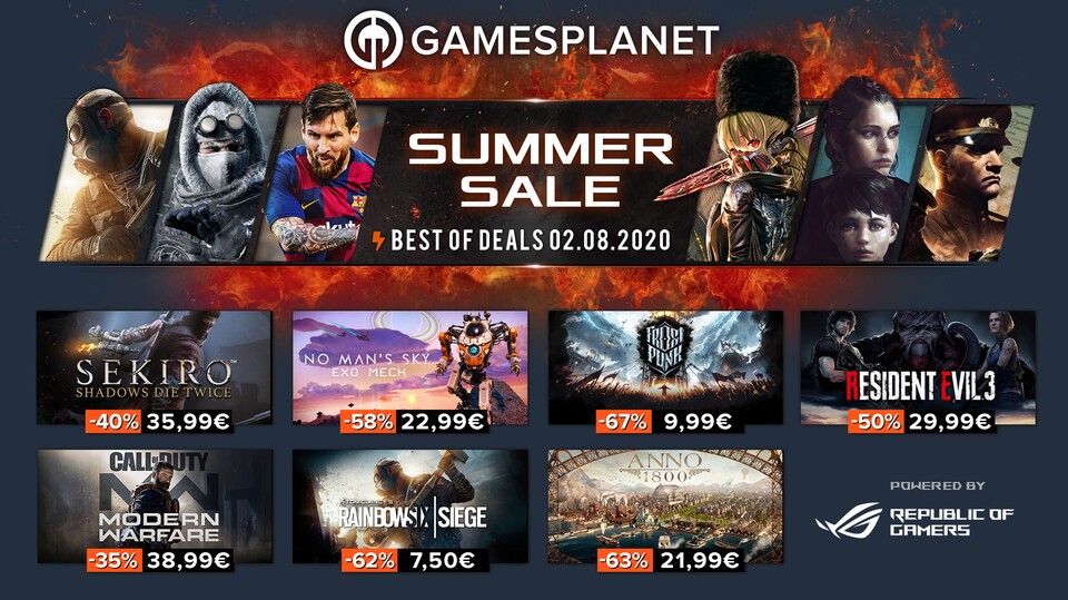 Das große Finale des Gamesplanet Summer Sale bricht an! Zum letzten Tag sind die besten Deals der letzten zehn Tage zurück. Holt euch Ausnahme-Titel wie Sekiro oder Anno 1800. Für den kleinen Geldbeutel gibt es Spiele wie die "Game of the Century Edition" von Saints Row 4 und Ancestors Legacy für unter 10 €!