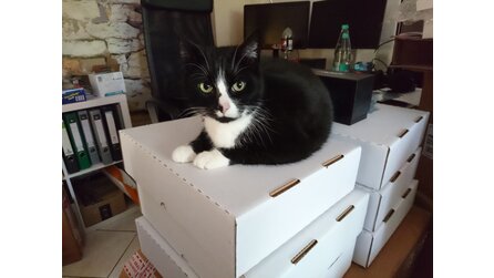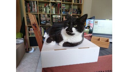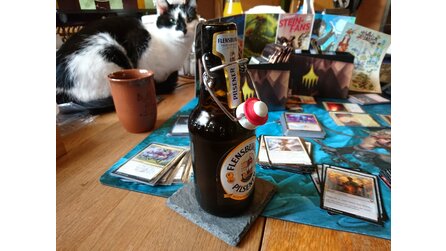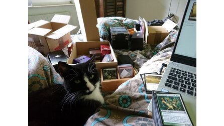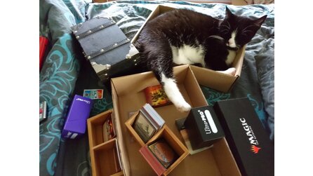 Hier sind die oben versprochenen weiteren Beispiele für Katzen, die oft dort liegen, wo sie nicht sollen, insbesondere auf und zwischen Magic-Karten und Kartensammelboxen. (Bildquelle: Nele Wobker/GameStar Tech)