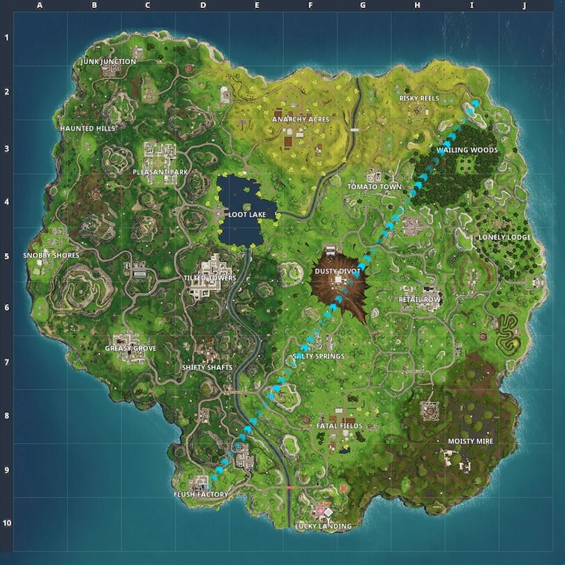 - Durchsuche 7 Truhen bei Salty Springs (5 Sterne oder 500 EP): Wie in jeder Woche geht es auch in Woche 8 wieder auf fröhliche Truhensuche. Diesmal sollt ihr sieben Stück in Salty Springs öffnen, also im Zentrum der Map, südlich des großen Kraters. Wie ihr sicherlich wisst, erkennt man die Truhen an ihrem summenden Geräusch. Unten haben wir eine Karte der Fortnite-Map eingefügt.