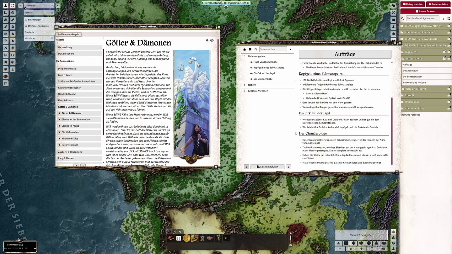 Deshalb habe ich beschlossen, die Regelgrundlage DSA 4.1 in den Ruhestand zu schicken und auf die aktuelle DSA-5-Version zu wechseln. Da hing nur ein ganz schöner Rattenschwanz dran. Meine ganzen Verwaltungstools, wie das ehrwürdige Meistergeister, sind mit DSA 5 selten kompatibel. Also habe ich nach einer Alternative gesucht und bin schließlich an VTT Foundry hängen geblieben. Seitdem kann ich nicht mehr ohne dieses Programm.