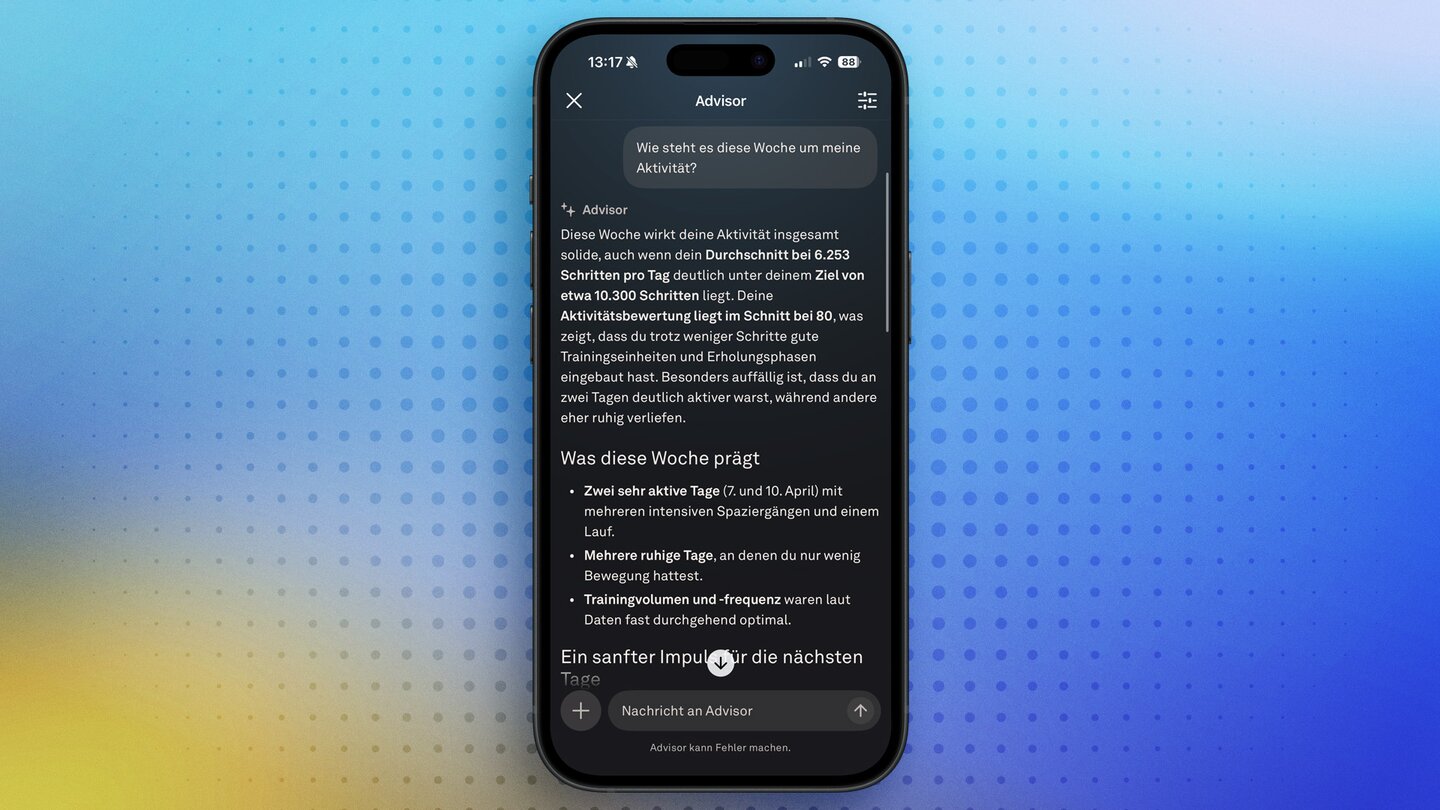 Ein einfaches Beispiel: »Wie steht es diese Woche um meine Aktivität?« Der Advisor zeigt den Durchschnitt der Schritte im Vergleich zu den eigenen Zielen an und welche Trainings absolviert wurden. Dabei wertet er auch das Trainingsvolumen und die Frequenz aus.
