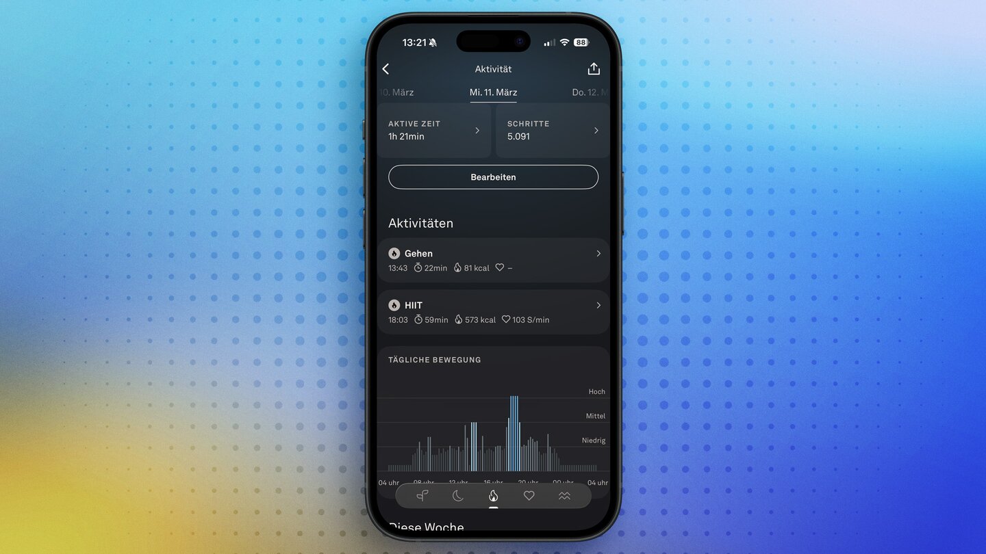 Das ist jedoch noch nicht alles: Weitere relevante Informationen wie Aktivität und Stresslevel wandern über den Tag verteilt nach oben und werden automatisch in Kontext zu meinem Wohlbefinden gesetzt.