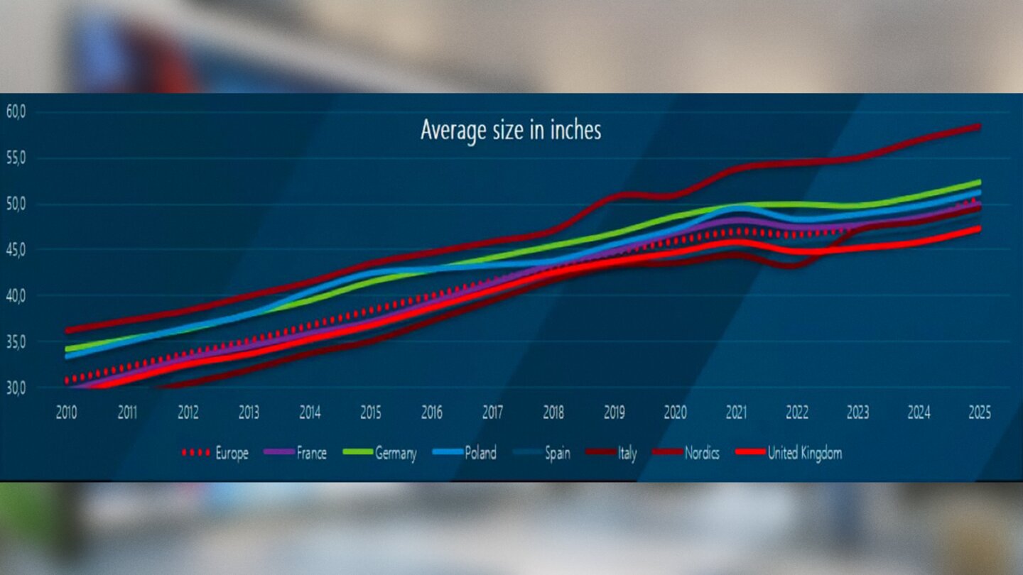 Das Marktforschungsunternehmen GfK stellte im Sommer 2024 fest (via Flatpanels HD): Wenn Europäer sich einen neuen TV leisten, erhöht sich die Displaygröße um 1,2 Zoll pro Jahr. So sieht es in Deutschland aus: